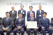 天草広域本部は12月23日、8月豪雨災害における応急復旧活動に貢献したとして、熊本県建設業協会天草支部(松下眞一支部長)へ感謝状を贈った。本部庁舎で贈呈式を行い、増田要一本部長が松下支部長に賞状を手渡した。