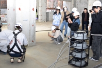 見学は、五木村甲の田口砂防堰堤と同村宮園の横手谷砂防堰堤で実施。過去の土石流災害における砂防堰堤の効果や役割などを学んだ。横手谷砂防堰堤では施工者の江川組(八代市)が協力し、クレーン車への試乗や遠隔臨場の実演、ドローンでの記念写真撮影なども行われた。 |