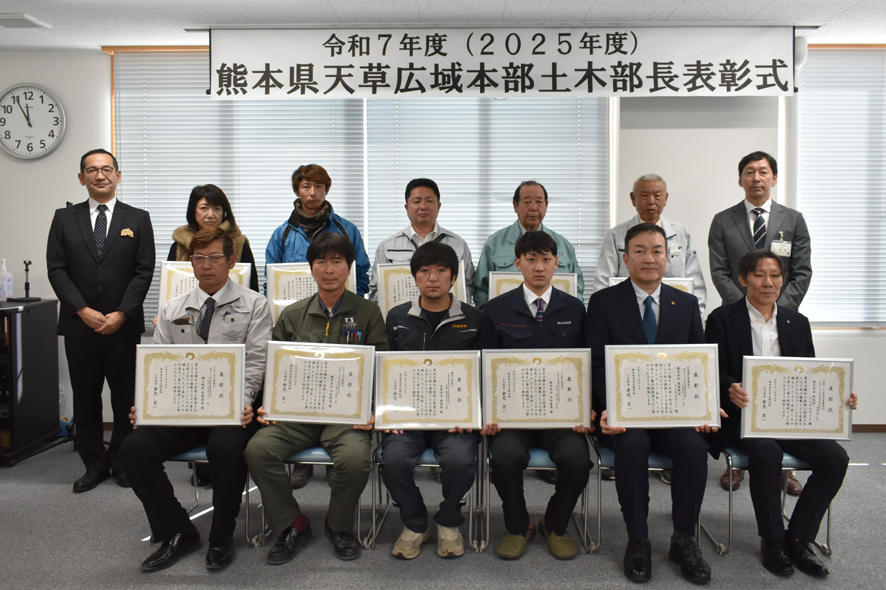 天草広域本部は17日、2025年度土木部長表彰式を広域本部庁舎で開いた。工事、業務、維持管理等で優秀な成績を修めた企業11社を選定。倉光宏一土木部長が代表者らに表彰状を授与した。