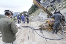 現場は、土井組が八代市東陽町河俣で、グランドアンカー31基を施工している宮原五木線(A071)道路土砂災害対策補助(防災)工事他合併。大通トンネル近くの現場事務所で平ア秀行現場代理人・監理技術者から概要や進捗状況などの説明を受けた後、安全パトロールチェック表に基づき関係書類等を約30分かけて確認。大通2号橋下部の現場に移動し、安全掲示板や資材保管場所などを見回った。アンカー削孔中の地上20b超の足場まで上り、作業場や使用重機、移動経路等の安全を確認した。 |